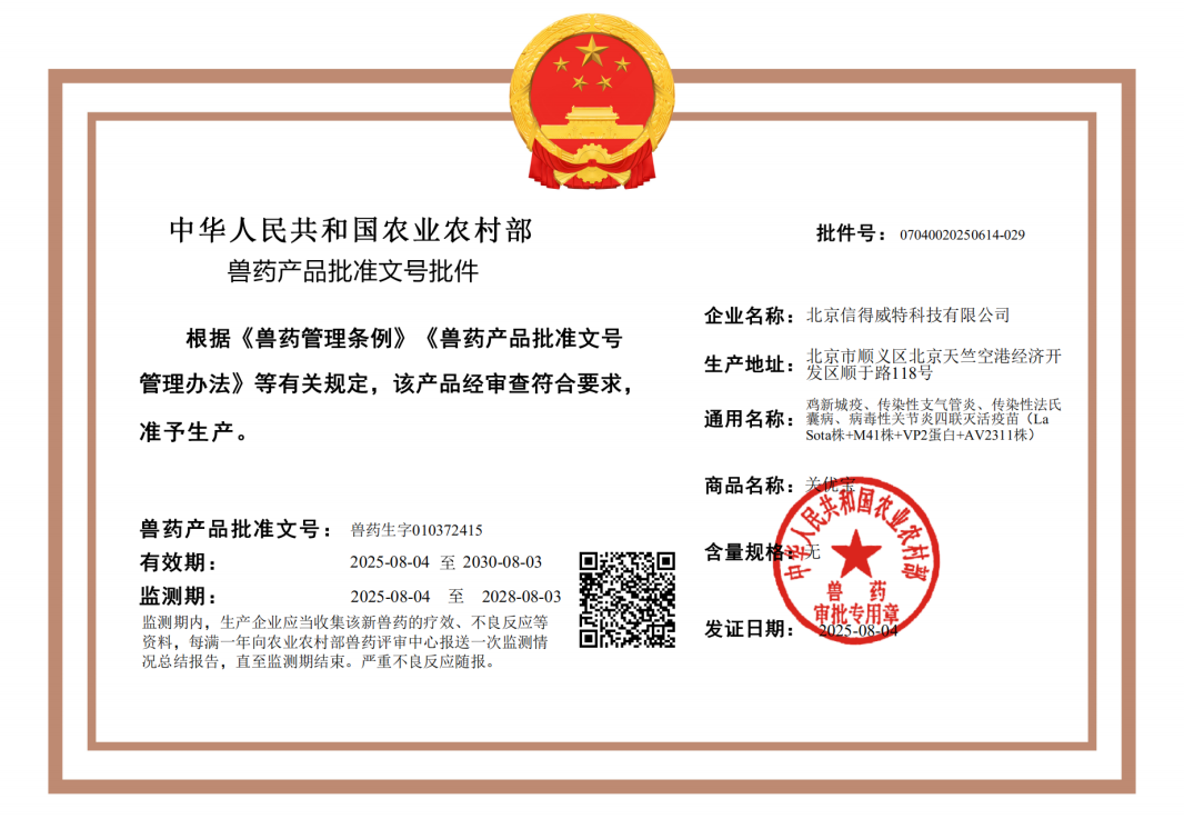 2025年8月4日,北京信得威特科技有限公司的鸡新城疫、传染性支气管炎、传染性法氏囊病、病毒性关节炎四联灭活疫苗(lasota株 m41株 vp2蛋白 av2311株),正式获得农业农村部兽药产品批准文号。