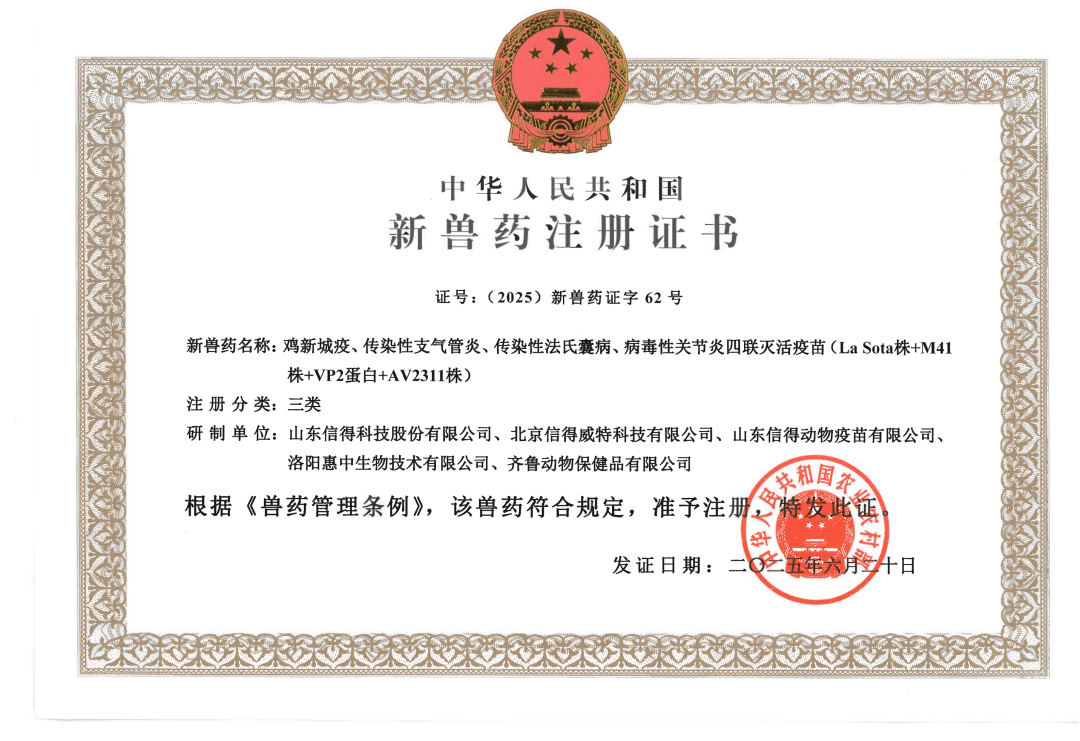 根据《兽药管理条例》和《兽药注册办法》规定,农业农村部经审查,批准山东信得科技股份有限公司、北京信得威特科技有限公司、山东信得动物疫苗有限公司与其他单位联合申报的“鸡新城疫、传染性支气管炎、传染性法氏囊病、病毒性关节炎四联灭活疫苗(la sota株 m41株 vp2蛋白 av2311株)”为新兽药,并于2025年6月20日核发了《新兽药注册证书》。