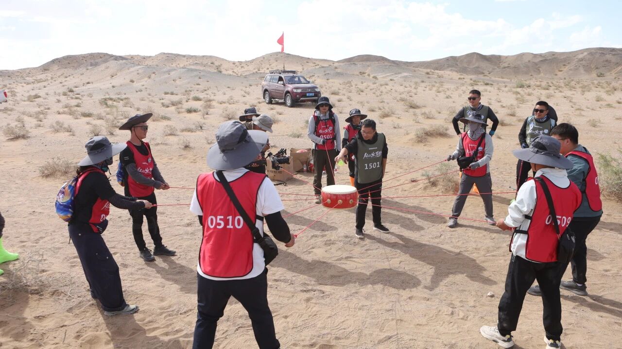 为凝聚团队向心力,徒步中特别设计了团队挑战环节。在“明心鼓”项目中,各队默契配合、同心击鼓;而随后的“同路同心”项目,则成为本届戈壁最艰苦、也最动人心魄的篇章。